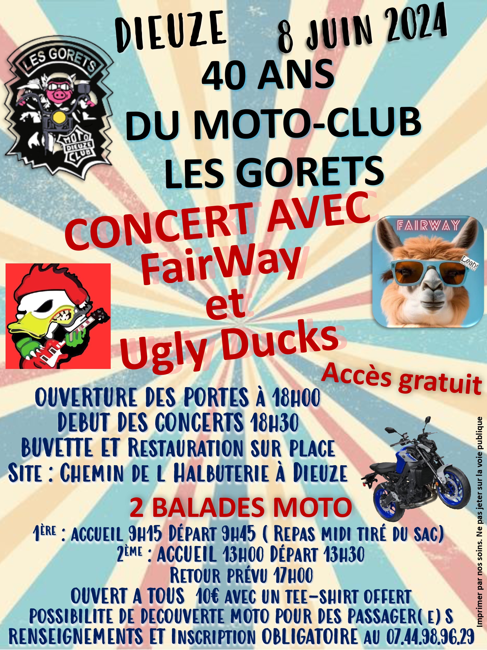 08 juin Lieu Chemin de l'Halbuerie57260 DIEUZE Balades à moto à 9h45 et 13h30, concerts à 18h30 Partager sur FacebookPartager sur TwitterPartager par email Cliquez pour activer