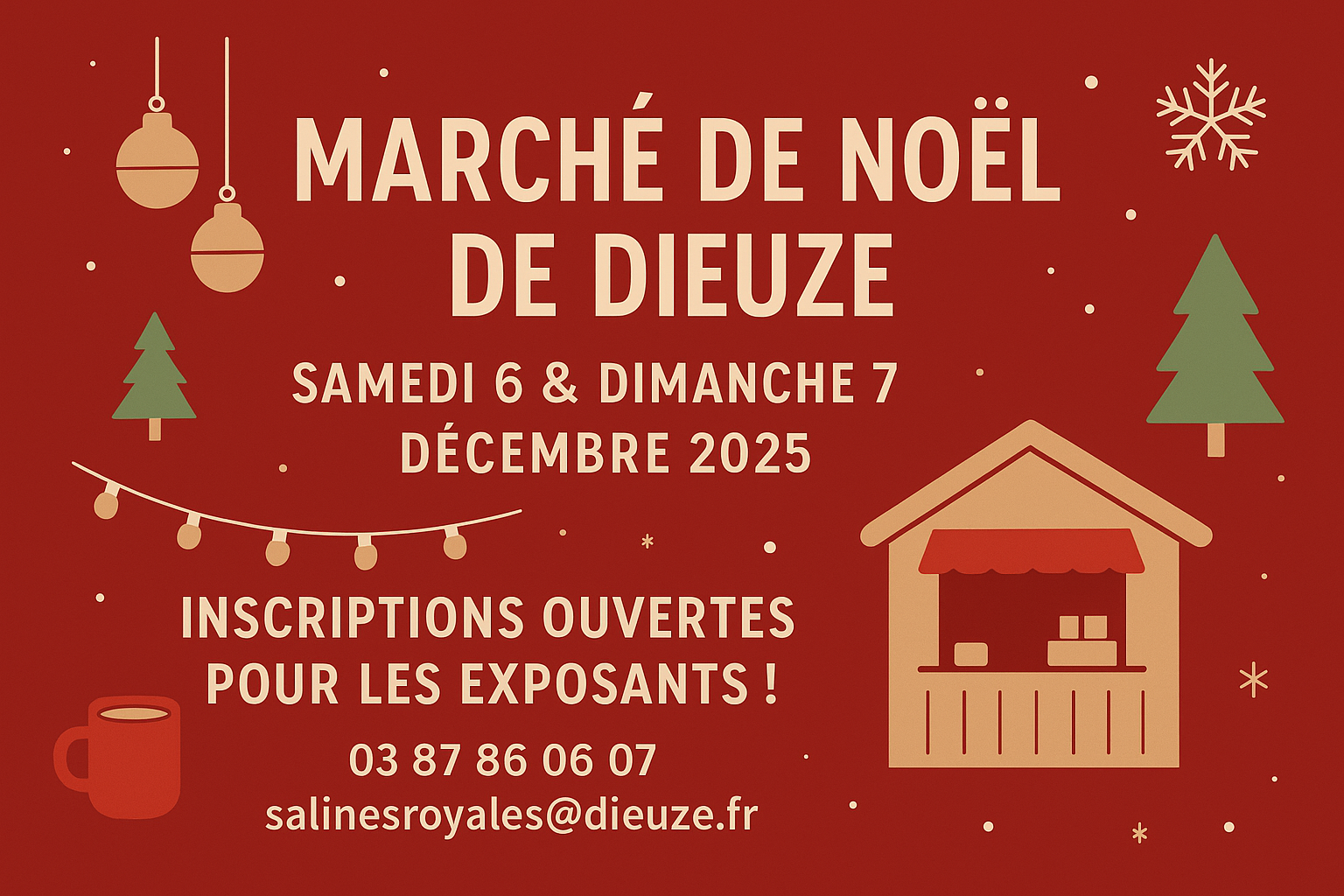 La Ville de Dieuze organise son Marché de Noël samedi 6 et dimanche 7 décembre 2025 dans l'enceinte du site historique des Salines Royales. Si vous souhaitez participer en tant qu'exposant, vous trouverez les documents nécessaires à votre inscription ci-dessous.