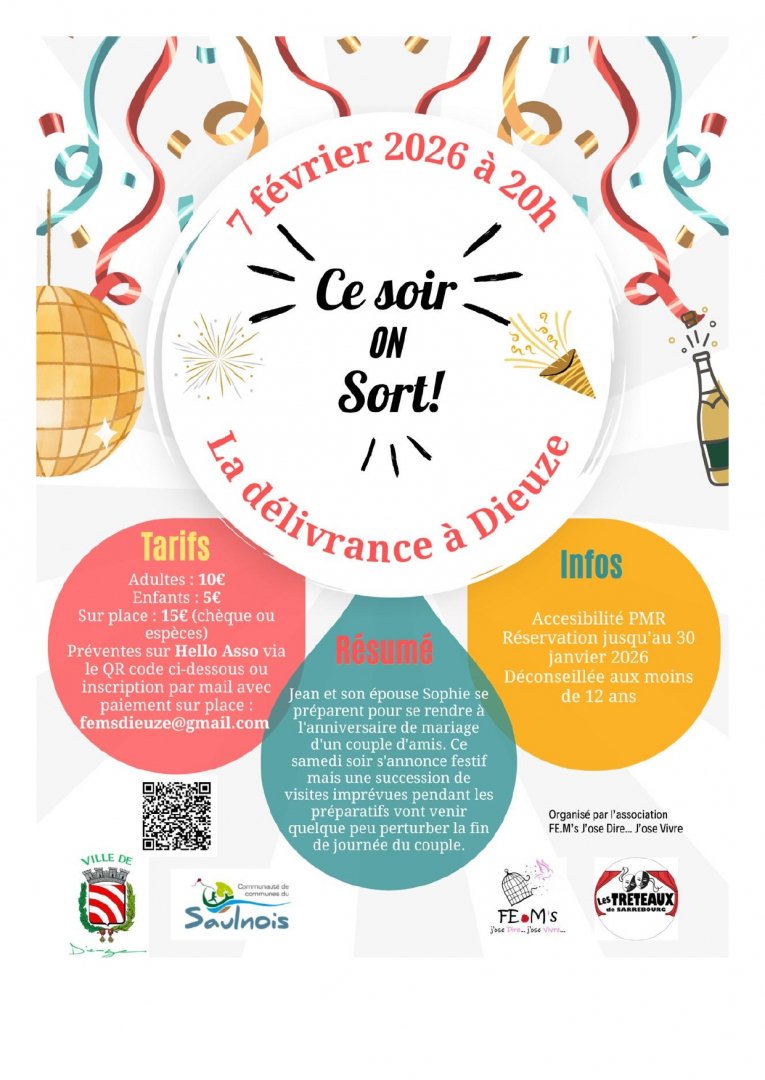 Samedi 7 février 2026 à 20h à la Délivrance, retrouvez la pièce de théâtre "Ce soir on sort!".