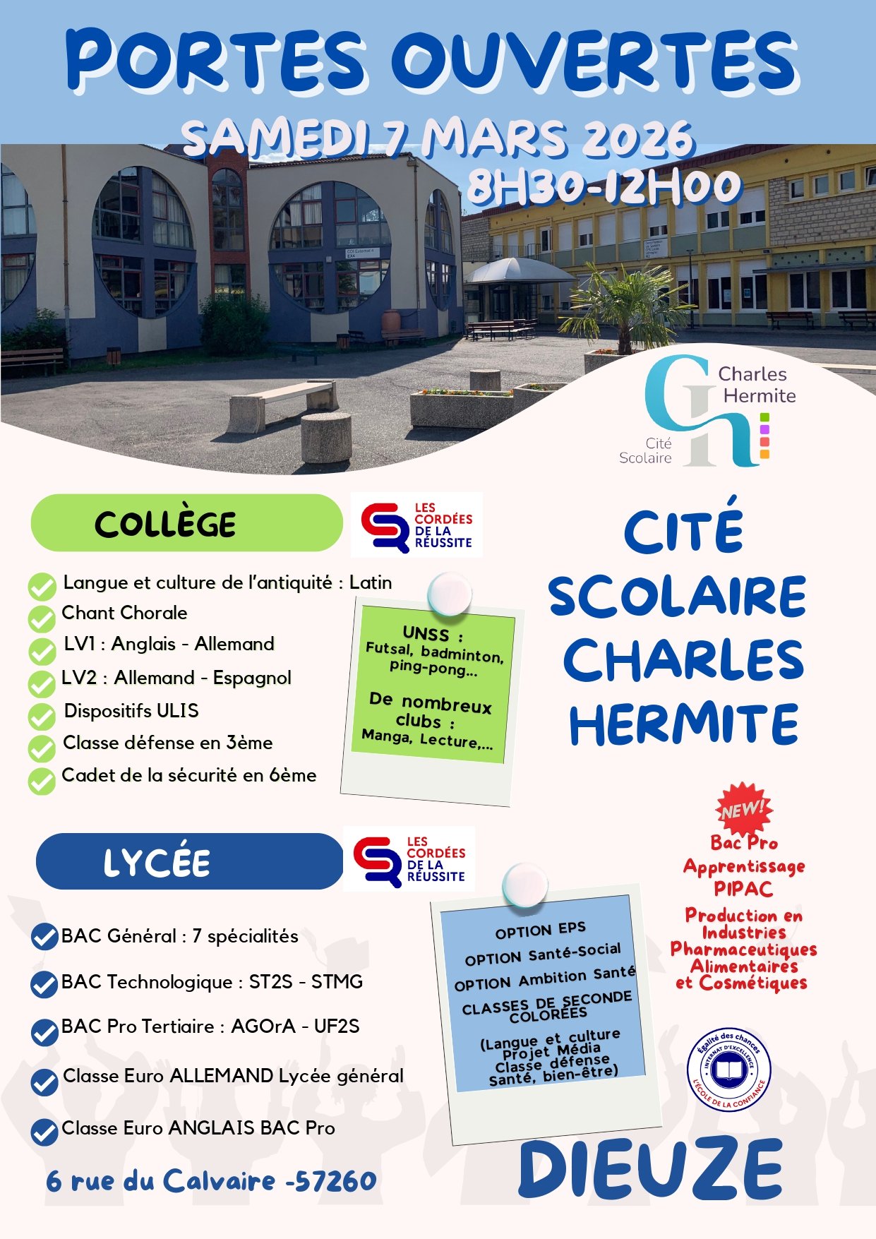 07 mars Lieu Cité Scolaire Charles Hermite6, rue du Calvaire57260 DIEUZE De 8h30 à 12h Partager sur FacebookPartager sur TwitterPartager par email Cliquez pour activer